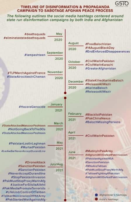 A timeline of social media hashtags centered on state run disinformation campaigns by both India and Afghanistan showed clearly the intent and the targets. The hastags included #FreeBalochistan, #14AugustBlackDay, #CivilWarinKarachi, #KarimaBaloch, #HazaraGenocide, #SanctionPakistan.