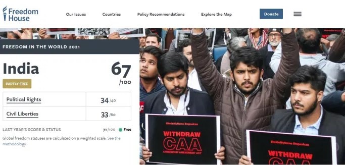 The latest Freedom House democracy report had degraded India from “Free” to “Partly Free”.