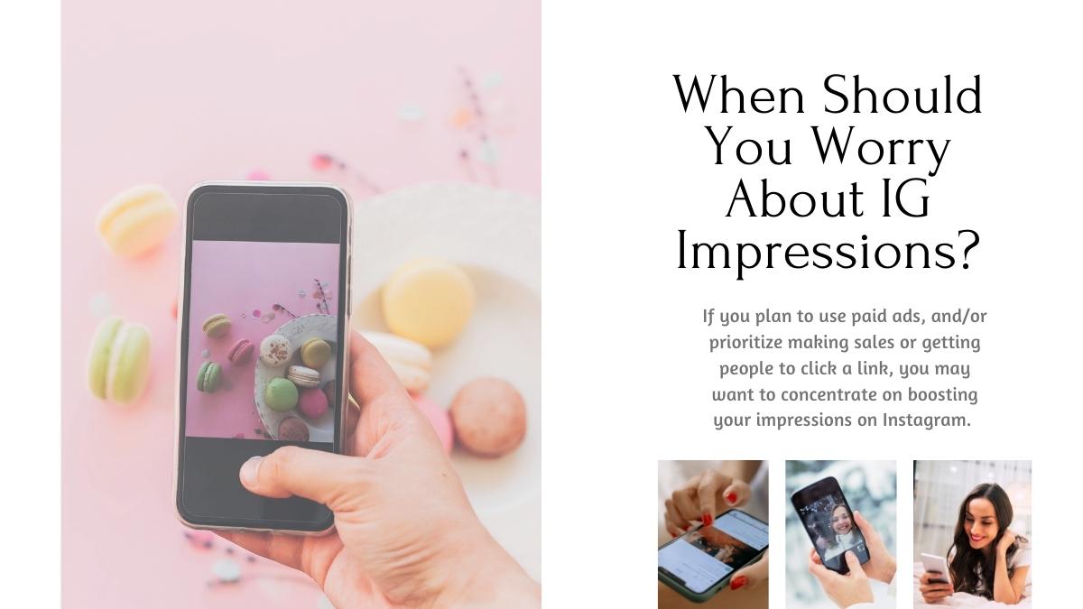 If you plan to use paid ads, and/or prioritize making sales or getting people to click a link, you may want to concentrate on boosting your impressions on Instagram.