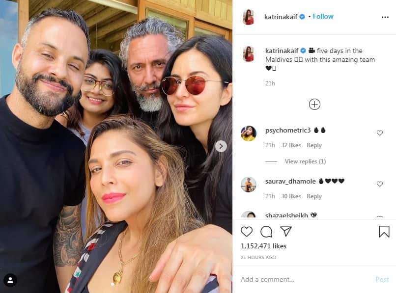 By sharing a glimpse of her Maldives vacation, Bollywood actor Katrina Kaif on Tuesday treated fans to adorable pictures along with her team at the exotic holiday destination.