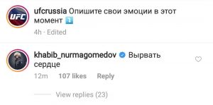 When the UFC’s Russian Instagram account shared a picture of that iconic scene, asking fans to describe their emotions at the moment Khabib submitted McGregor, the fighter himself replied.