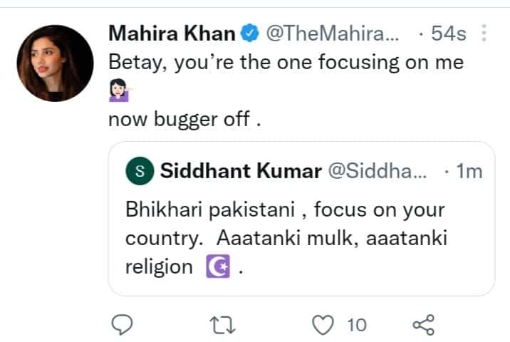 A Twitter user wrote, “Bhikhari (Beggar) Pakistani, focus on your country. Aaatanki mulk, aaatanki religion (Terrorist country, terrorist religion).” The post was later deleted. Mahira Khan also replied and said: “Betay, you’re the one focusing on me now bugger off.”