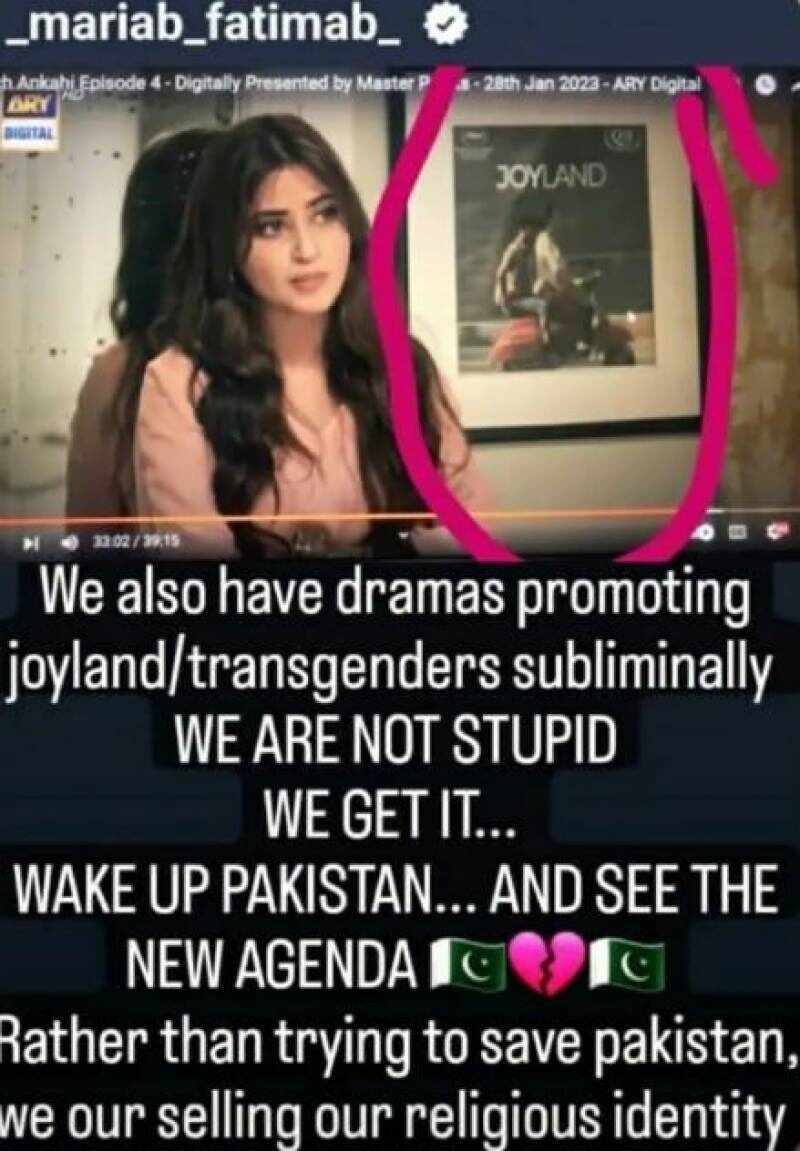 A picture of the poster of Joyland appeared in one of the scenes of the drama serial. Maria B shared the image of the scene on her social media account and expressed her anger in her Instagram story regarding the promotion of the film based on the love between transgender.