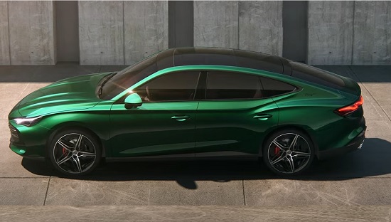The side features a stretched wheelbase, a sharp shoulder line, a design that is generally smooth, and a rearward-raking roofline that combines with a downward-sloping trunk lid to give the impression of a sportback.