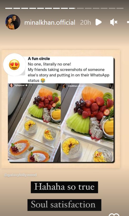 Social media users had a field day yesterday. On Wednesday, Minal Khan also joined the bandwagon perhaps in an attempt to respond to the ongoing trolling. She put a meme that was about people who screenshot other people’s Instagram stories and post them as their own. While sharing the picture, she said, “So true. [It’s] soul satisfaction,” while laughing. The actress seemed a bit guilty about being caught.