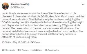 “Imran Niazi’s statement about the Army Chief is a reflection of his diseased and obsessive mindset. As DG ISI, Gen Asim Munir unearthed the corruption syndicate of Niazi and that is why he has been maligning the COAS from day one. It is also his admission of masterminding the tragic and disgraceful incidents of terrorism undertaken by PTI goons at his behest,” PM Shehbaz Sharif said on Twitter.