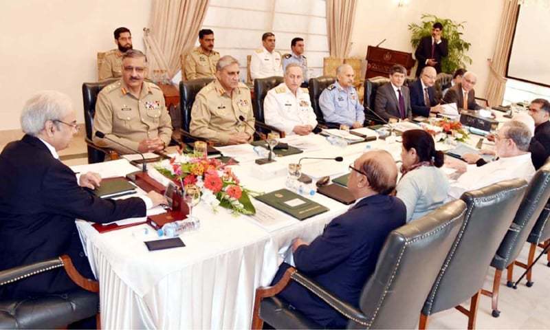 The 25th meeting of the National Security Committee was attended by the members of the newly-appointed interim cabinet, Chairman Joint Chiefs of Staff Committee (CJCSC) Gen Zubair Mahmood Hayat, Chief of Army Staff (COAS) Gen Qamar Javed Bajwa, Chief of Naval Staff Admiral Zafar Mahmood Abbasi, Chief of Air Staff Air Chief Marshal Mujahid Anwar Khan and other civil and military officials. The caretaker PM headed the meeting.