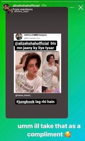 Shah has been breaking the internet with her new short haircut. With her trendy look, she caught the attention of her fans and followers who showered her with praise until a troll compared her to a popular Korean pop band, BTS. An Instagram user uploaded her photo on his story and commented that she is resembling Jungkook, a member of the K-pop band. “Alizeh Shah ready to join BTS,” said the user.