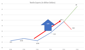 India’s exports of goods and services for FY2022-23 surpassed its target, reaching $770 billion. They are now aiming to achieve at least $900 billion worth of exports for FY2023-24 and have set a long-term goal of $2 trillion by 2030. India’s Integrated and Sustainable Textile Policy FY2023-2028 has provided export-oriented manufacturers with significant incentives, such as government equity, low-interest financing, and electricity subsidies. The power tariff of 6 cents/kWh offered to Indian textile manufacturers in Maharashtra* due to subsidies is significantly lower than Pakistan’s rate of 16 cents/KWh. Additionally, Indian manufacturers enjoy subsidized credit at 5-7% interest, while Pakistani manufacturers face interest rates of over 22%.
