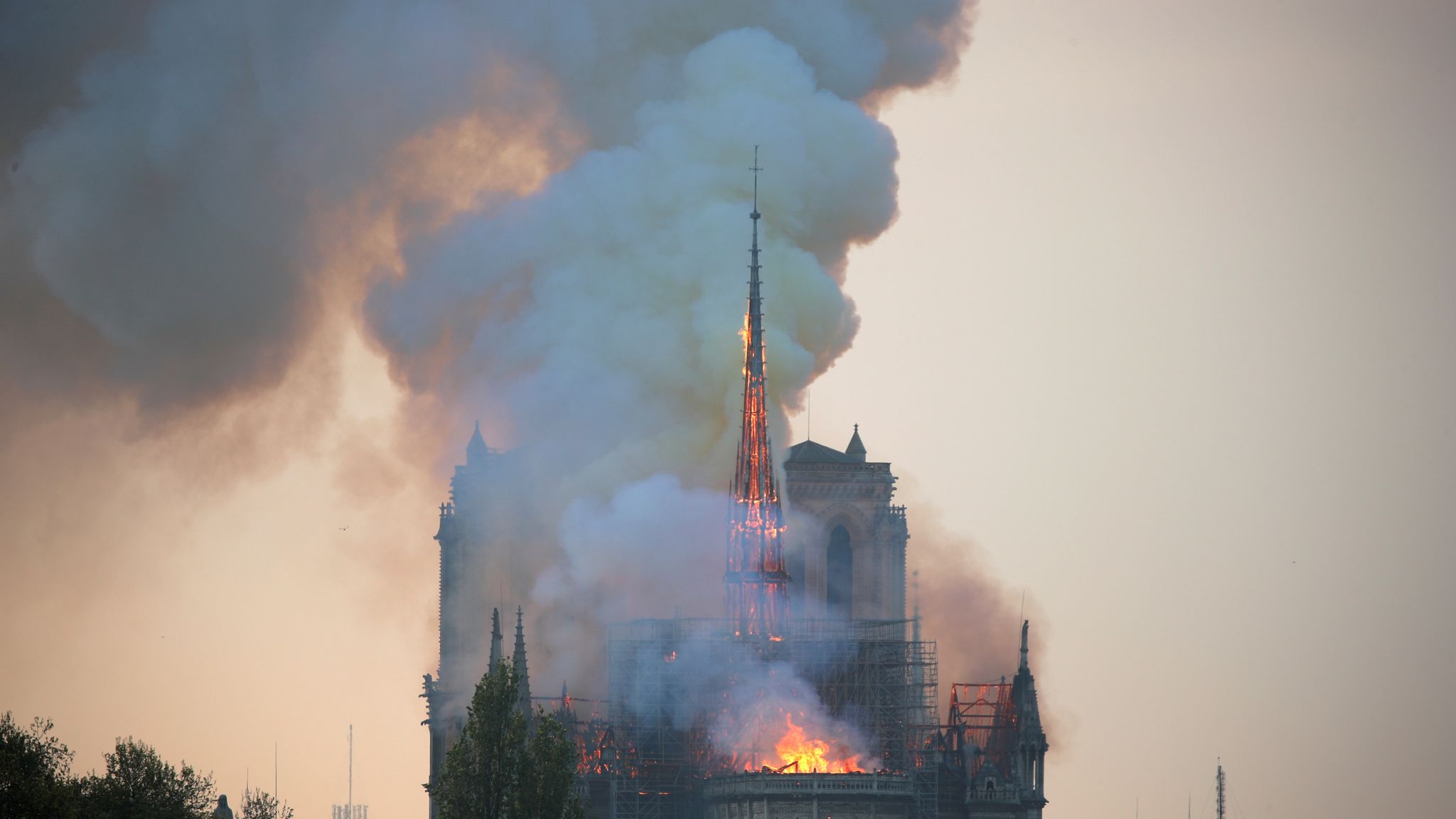 A fire that spread from the attic of Notre-Dame cathedral on Monday has caused its spire to crash to the ground, and devastated Paris’s historical monument.