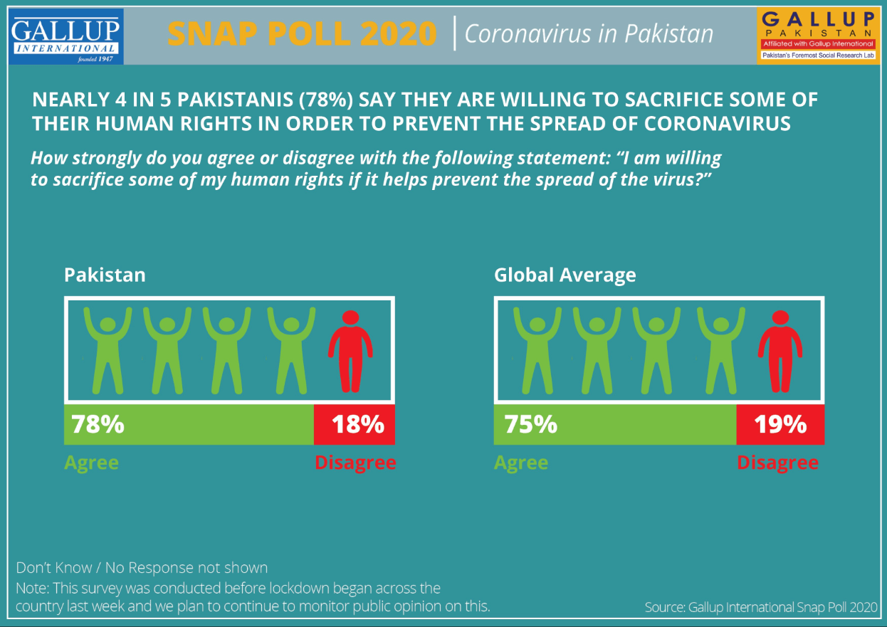 According to Gallup snap poll conducted in March 2020, 4 out of 5 Pakistanis (roughly 78%) were ready to forego some of their basic human rights to help put a leash on the spread of corona virus.
