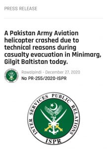 According to the Inter-Services Public Relations’ (ISPR) statement, the helicopter crashed due to technical reasons during a casualty evacuation operation in the Minimarg area of Gilgit Baltistan.