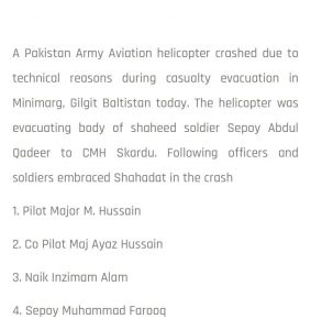 Both pilots — Major M. Hussain and Co-Pilot Major Ayaz Hussain, Naik Inzimam Alam, and soldier Muhammad Farooq claimed martyrdom in the crash, the army confirmed.