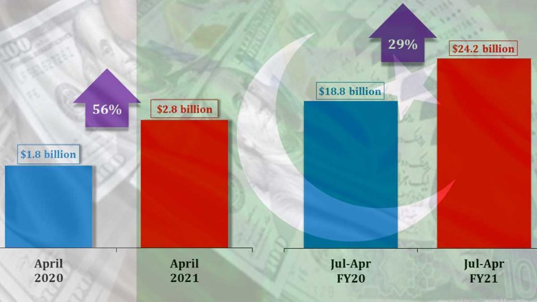 According to the State Bank’s recent data, the remittances has reached an all-time high in $2.8 billion in April 2021. The remittances have increased Year-on-Year in April 2021 by 56 percent compared to April 2020, when it was $1.8 billion. Similarly, it has gone up from $18.8 billion from July to April 2020 to $24.2 billion during the same period in 2021.