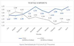 Textile exports for April, 23 clocked in at $1.24 billion, a staggering $500 million less than the previous year’s exports for April, 22 and a colossal $1 billion per month short of the capability due to enhanced capacity. It is disheartening to see that over the same time period, our competing countries such as Bangladesh, Sri Lanka and Vietnam posted impressive growth ranging from 10-30% in textile exports over the last year, while we struggle to keep up with our previous years’ exports. Exogenous factors i.e., demand and external market forces, cannot be blamed for our downfall as the decline is entirely the consequence of our shortsighted decisions and failure to follow through on proven policies such as providing a level playing field on energy tariffs.