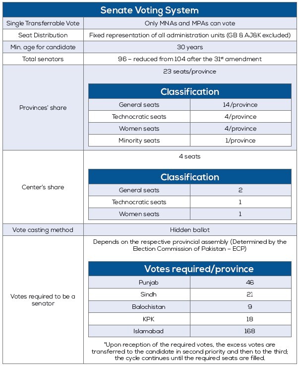 After the Twenty-Fifth Amendment, the number of seats in the Senate was reduced to 96, as the seats for FATA were removed after its merger with KPK. The fundamental sense of Senate being an upper chamber where all provinces – irrespective of their population size – have an equal representation stays. This is often compared to the US political system where even the largest states like New York and California, have only two senators like Idaho or Kentucky. But similarities end here because, in the US, senators are often hugely popular figures of their communities and are directly elected by the people (since the early 20th century).