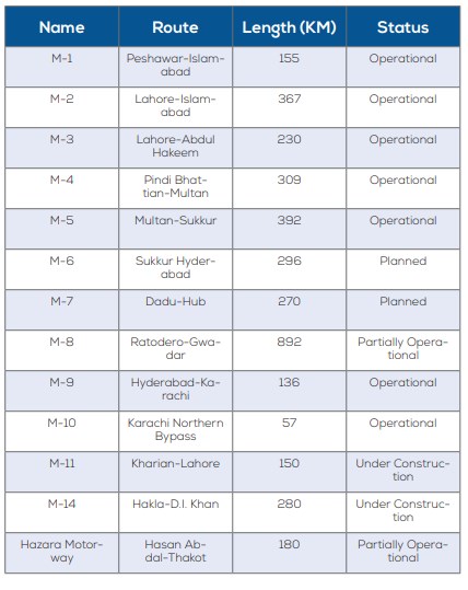 Maintained, owned, and operated by National Highways Authority (NHA), with the help of FWO, 2429 kms of multi-lane, high-speed, and controlled-access highways have been completed; whilst the remaining 1312 km are under construction and planning.