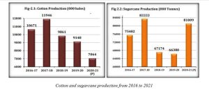 During 2020-2021, around a 12% increase in the cultivated area was observed for sugarcane. Cotton on the other hand was cultivated on 2,079 thousand hectares as compared to last year’s sown area of 2,517 thousand hectares showing a 17% contraction in the cultivated area. The factors contributing to this decline are biotic stresses due to pests, abiotic stresses due to climate change, and poor agricultural practices. This data indicates that land use patterns in crop cultivation in Pakistan are more associated with sugarcane farming than cotton cultivation.