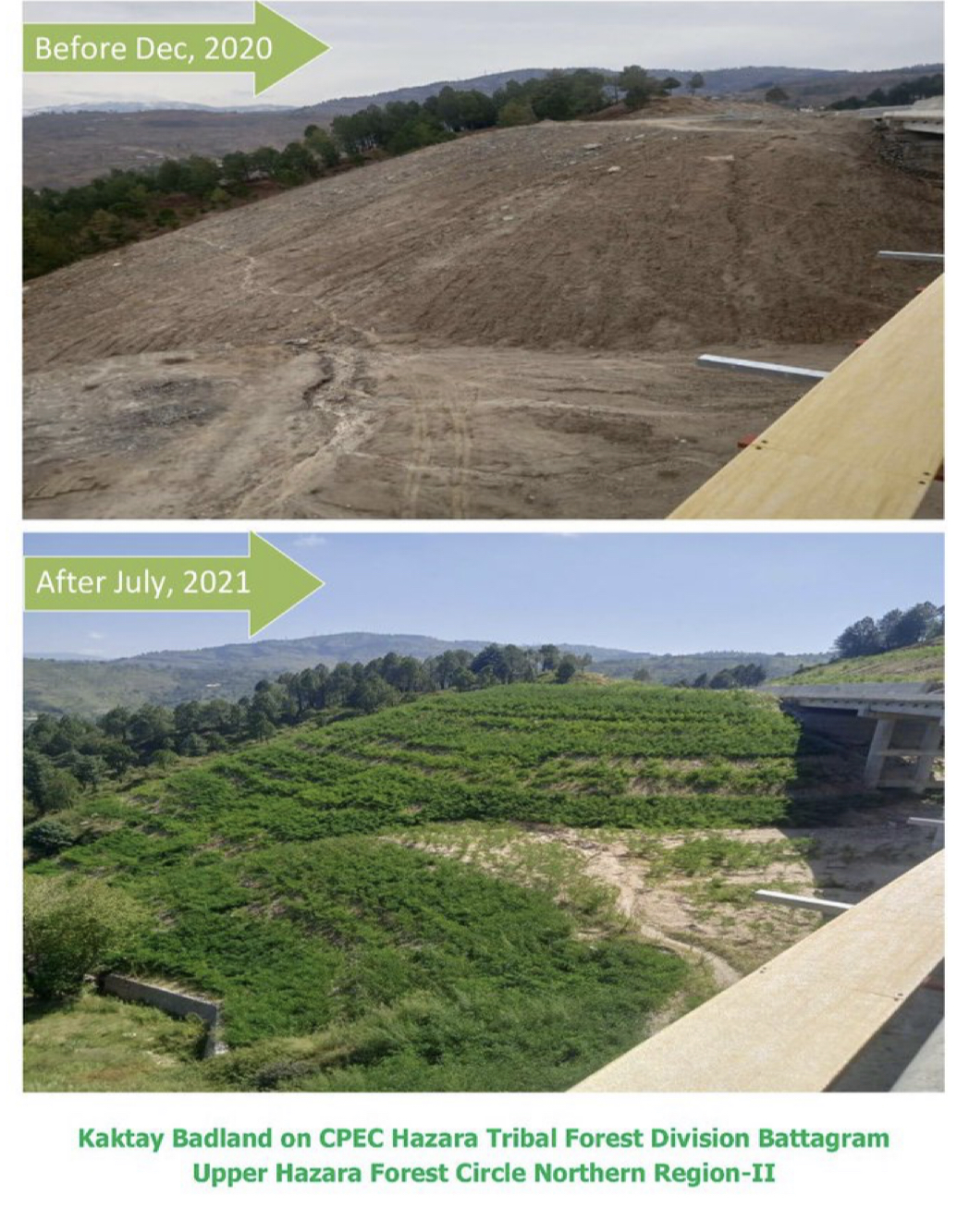 430,000 plants were planted at Kaktay Hazara, KhyberPakhtunkhwa. The land was treated under TBTTP and the species planted were Rubinia, Poplar, willow, Bottle Brush.