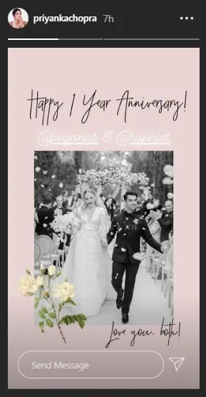 The Desi Girl of Bollywood and Global Icon, Priyanka Chopra shared a wish for brother-in-law Joe Jonas and wife Sophie Turner on their first wedding anniversary. The Sky Is Pink actress shared the picture of duo’s french wedding on her Instagram story and wrote, “Happy 1 year anniversary! Love you both.”