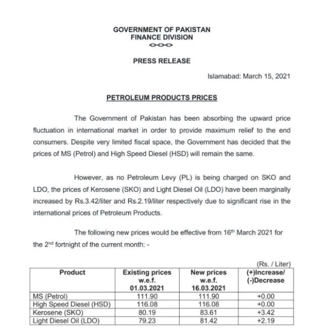 The new prices will be effective from today (March 16) till 31st March, 2021. The Ministry of Finance on Monday said, “The government of Pakistan has been absorbing the upward price fluctuation in the international market in order to provide maximum relief to the end consumers.” Petrol price will remain at Rs111.9 per litre and diesel Rs116.07 while LDO will now cost Rs81.42 and kerosene Rs83.61/litre.