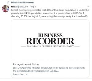 Recently Miftah Ismail retweeted an article by Business Recorder on Pakistan’s Poverty Line. As per the article, currently, 40% of Pakistan’s population lives below the poverty line. Members of PML-N remain consistent with their narrative of Pakistan’s dire economic conditions under PTI.