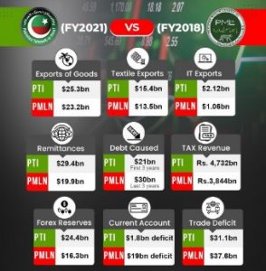 As per the analysis, Pakistan’s economic performance for FY2021, under PTI was comparatively better. According to statistics, PTI exported $25.3 billion worth of goods, whereas PML-N exported $23.2 billion. Textile exports too witnessed a growth of more than $1 billion under PTI.