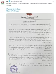 PTI has issued a detailed response to Inter-Services Public Relations (ISPR) statement where the military’s media wing termed May 9, the day clashes and protests ensued, a “black chapter in history”.