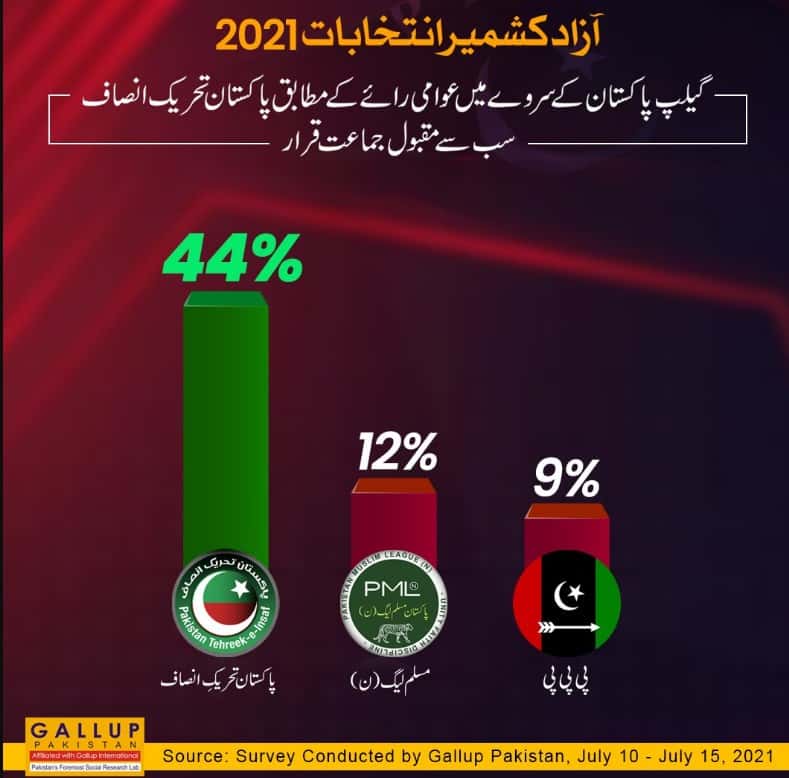 According to a survey of Gallup Pakistan, 44 per cent in AJK think that PTI will win the election on 25th July 2021 while PML-N has 12 per cent and PPP 9 per cent popularity.