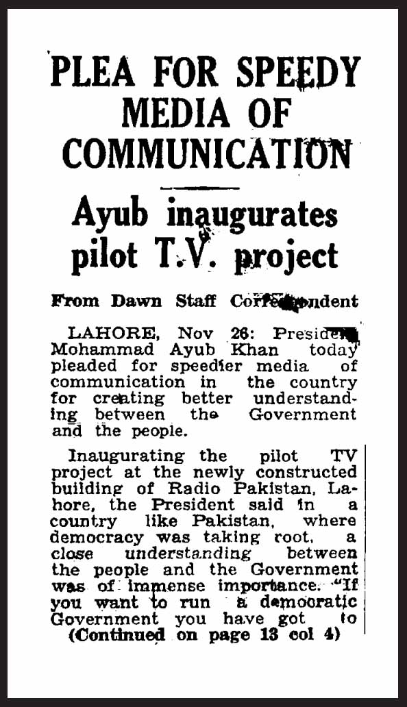 President Ayub Khan inaugurated the first TV station transmission, commissioned from Lahore; and a month later, from Dhaka. A third center was established in Islamabad in 1965 and the fourth in Karachi in 1966. Three years later; a public limited company, Pakistan Television Corporation, came into being.