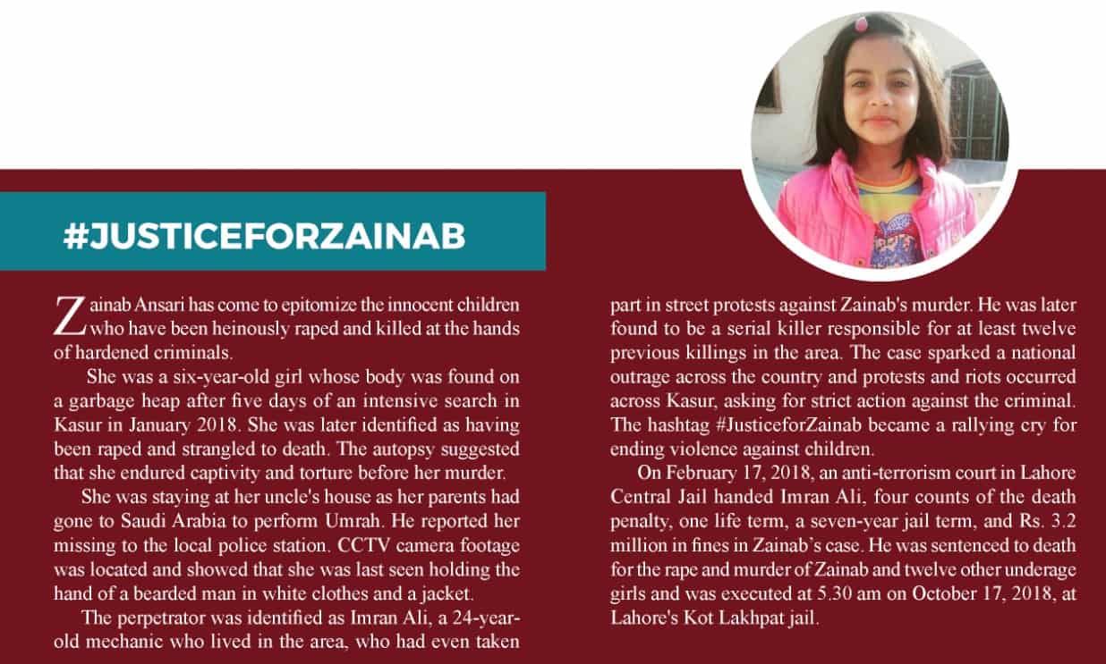 In October 2018, a divisional bench of the Lahore High Court, headed by Justice Sardar Shamim, while hearing a petition, filed by Zainab’s father, seeking public execution of convicted Imran for her rape and death, relied upon Section 22 of the Anti-Terrorism Act, 1997, which gives the government power to specify the manner, mode, and place of execution, and dismissed the said petition by discarding all the arguments in favor of public hangings.