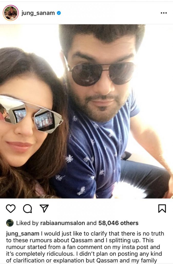 Sanam said, “I would just like to clarify that there is no truth to these rumours about Qassam and I splitting up. This rumour started from a fan comment on my insta post and it’s completely ridiculous.”