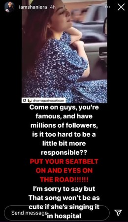 “Come on guys, you’re famous, and have millions of followers, is it too hard to be a little bit more responsible?” Akram commented while sharing the story. “Put your seatbelt on and eyes on the road! I’m sorry to say but that won’t be as cute if she’s singing it in the hospital.”