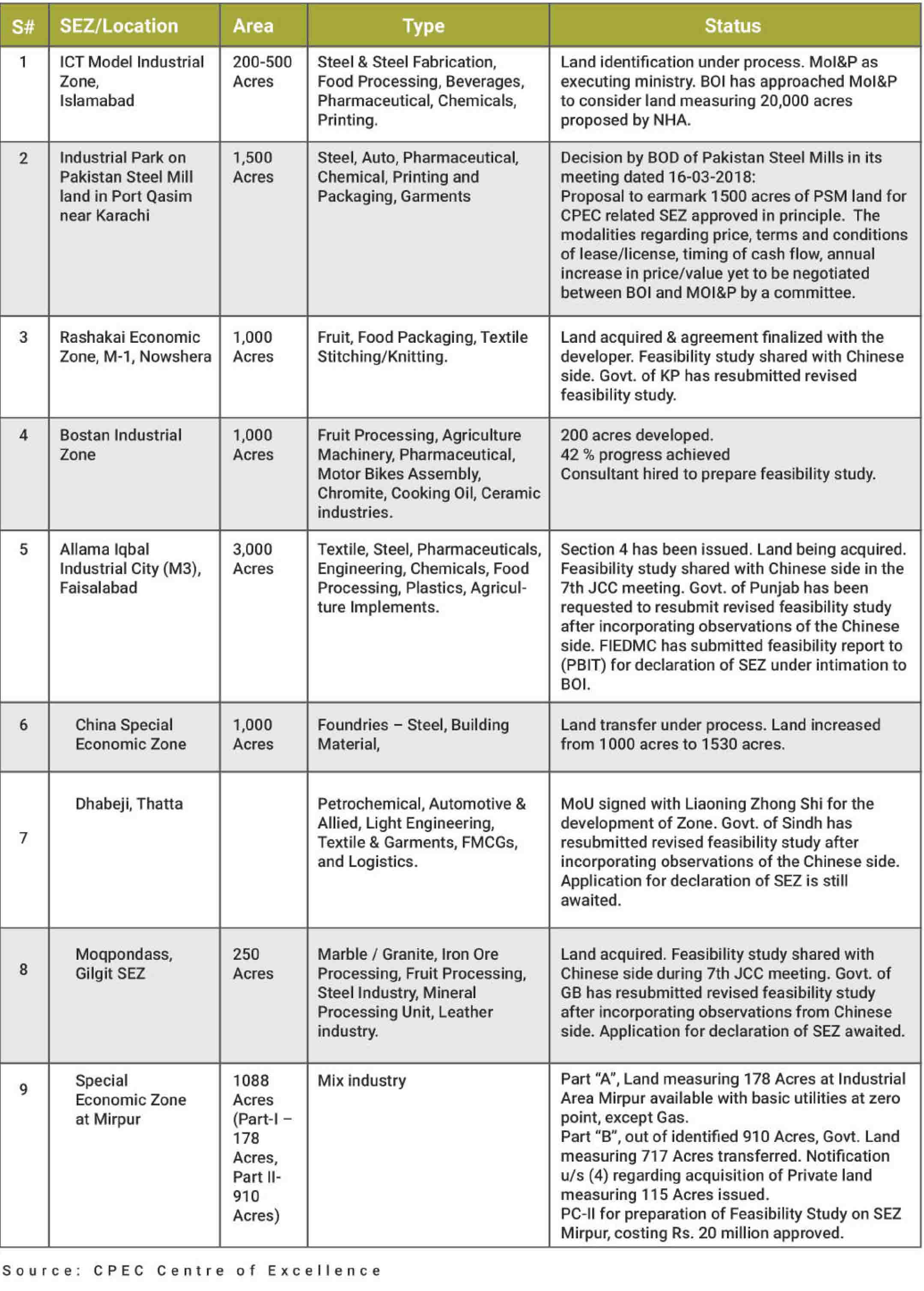 Islamabad based CPEC Centre of Excellence (CoE) has conducted very comprehensive research on various dimensions of CPEC related programs in Pakistan and produced series of working papers on Belt and Road Initiative and economic corridors mechanism and their research work has frequently been consulted for this article. According to their research, the current status of these nine prioritized SEZs are summarized as under: