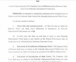 A bill was passed today by the National Assembly (NA) of Pakistan to extend the jurisdiction of Peshawar High Court (PHC) and the Supreme Court (SC) to FATA. This bill was moved by the newly assigned law minister Chaudhry Mehmood Bashir Virk. This bill was a step towards mainstreaming FATA and merging it with Khyber Pakhtunkhwa (KP) province of Pakistan. It was initially suggested by the FATA Reforms Committee. Opposition leader Khurshid Shah called this bill a huge success.