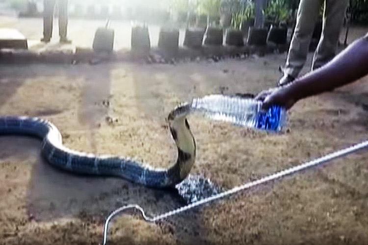 Watch: Thirsty Cobra drinking water from plastic bottle offered by humans