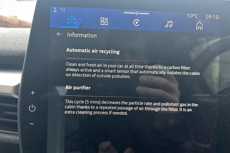 I’d already noticed how surprisingly unaffected I’d been by hay fever at this time in the morning, when it normally ares up. It turned out the Scenic’s cabin air filter is always on, although you can run a five-minute cleaning cycle through one of the menus (‘Air quality’).