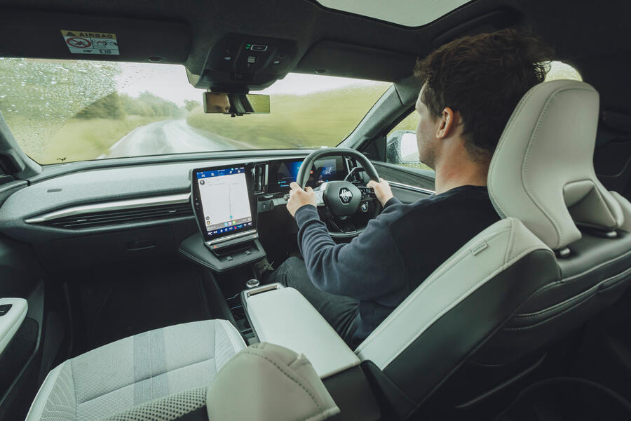 Charging speeds also increase with the battery capacity, from a standard 130kW to 150kW. Our test car has the bigger battery and is in Iconic trim (Techno and Esprit Alpine are also offered), which tops the range and, on the subject of range, has 10 miles shaved off the entry Techno model’s mostly due to the larger, 20in alloys that come with this trim.