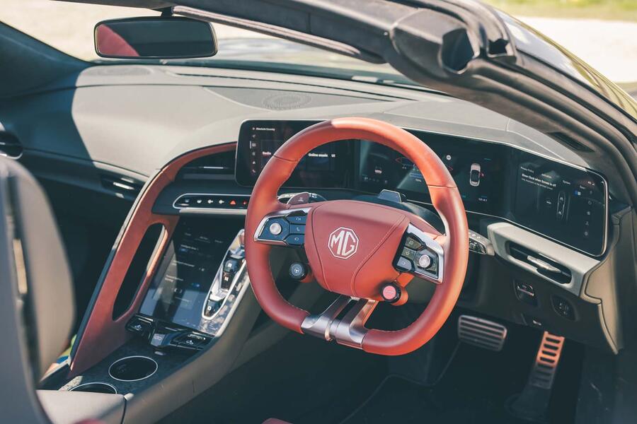 There are two interior colour options, grey or red, both at £0. This one is red, and it’s rather restrained. And that’s it. MG is not one to make you delve into an options list. There is one wheel choice (20in alloys with Pirelli P Zero tyres, 245/40 fronts, 275/35 rears), heated seats, heated steering wheel, electric seats, electric hood, electric doors, a Bose stereo, adaptive cruise control, vehicle-to-load capability and more ADAS than are mandatory.