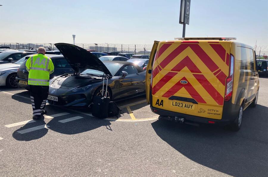 With bonnet up and terminals located, I phoned the car park operator who kindly sent a man in a van with a 12V jump pack, but it wasn’t quite good enough to coax the Cyberster into life.