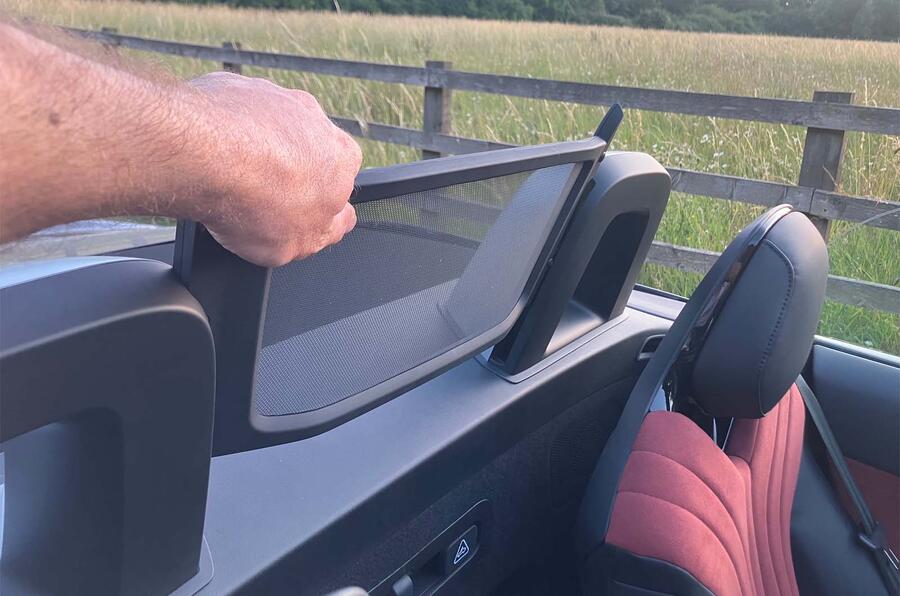 Having it in place doesn’t make too much difference to the amount of buffeting around your head, but it does seem to reduce the amount of turbulence swirling around in the middle of the cabin, curiously. Without it in, I’d want to secure any valuable receipts. Keeping the side windows up also considerably reduces turbulence, so unless