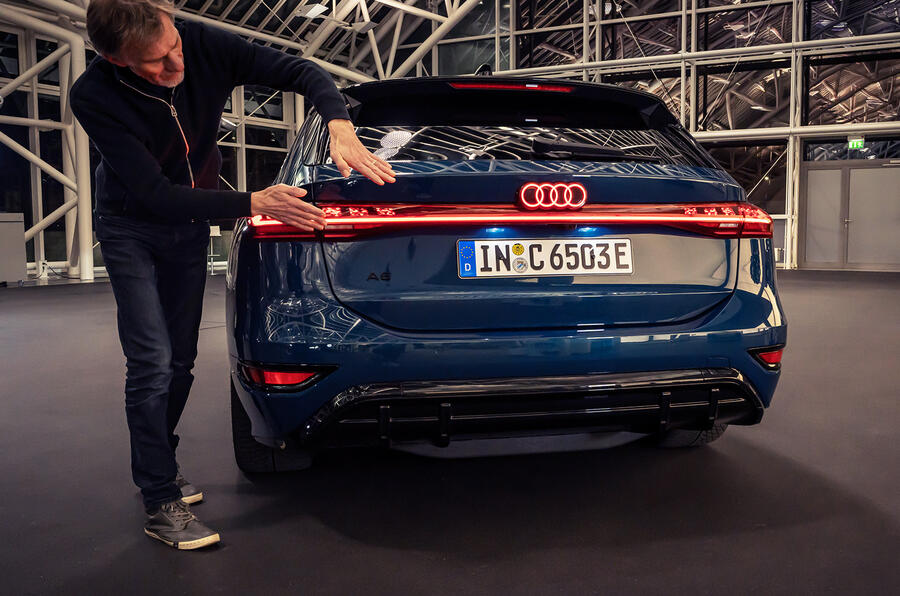 And finally the A6 e-tron. This is really special for us, because this is the first electric Avant. The overall ethos here is that the A6 has been designed even more smooth than the e-tron GT and the Q6 e-tron because we wanted to show the airflow around the car. One sign of this is the single crease running all the way down the side of the car.