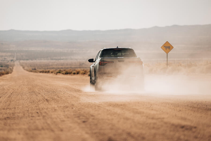 So we go too, off the main highway and onto the dirt track, which you don’t strictly need a pick-up’s 4x4 system to navigate, but which isn’t unhelpful in deeper sand. One suspects this is as hard as most Santa Cruzes will be worked but there’s plenty of terrain like this in the US, and it deals with it nicely, slipping around entertainingly.