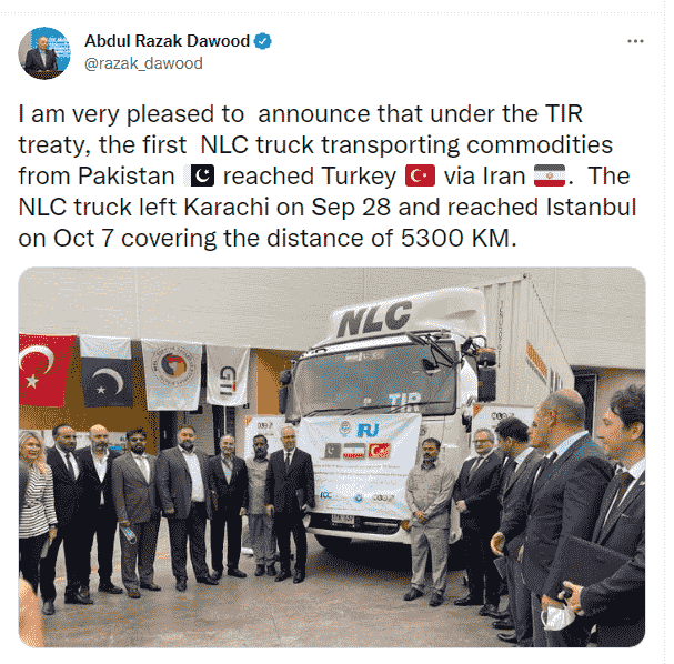 The National Logistics Cell (NLC) recently completed the first-ever commercial road movement under the TIR (Transports Internationaux Routiers) to Turkey and Azerbaijan through Iran.