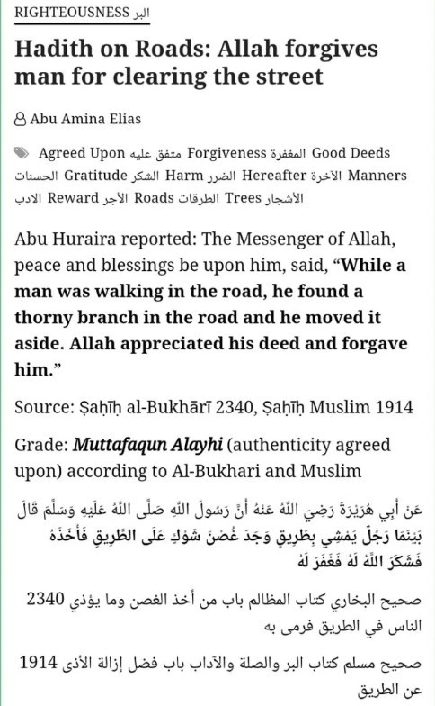 Social Media users shared Hadith wherein Abu Huraira reported as saying that Holy Prophet (PBUH) said; “While a man was walking in the road, he found a thorny branch in the road and he moved it aside. Allah appreciated his deed and forgave him.”