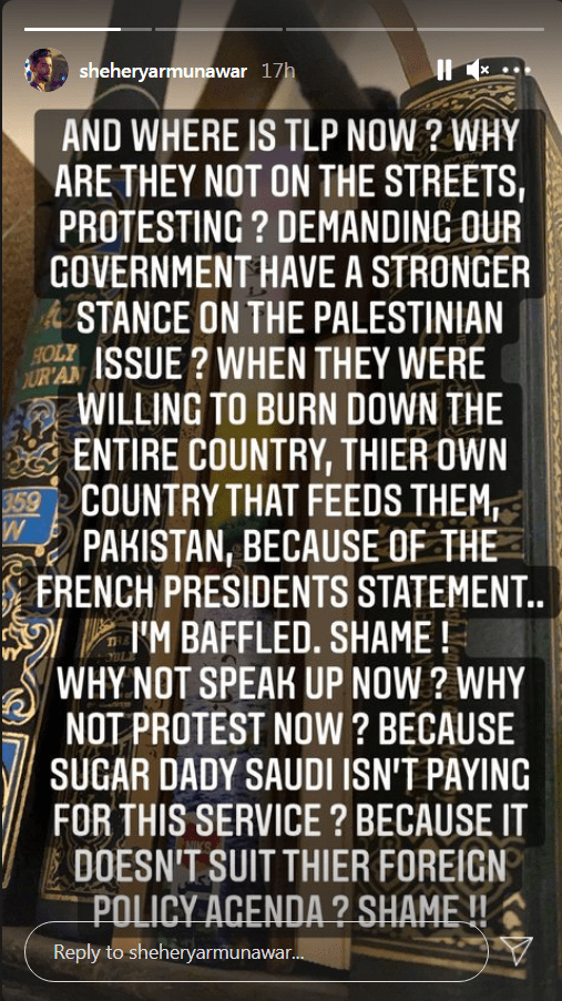 “Where is TLP now? Why are they not on the streets protesting? Demanding our government have a stronger stance on the Palestinian issue? When they were willing to burn the entire country, their own country that feeds them, Pakistan, because of the French president’s statement. I’m baffled!”,