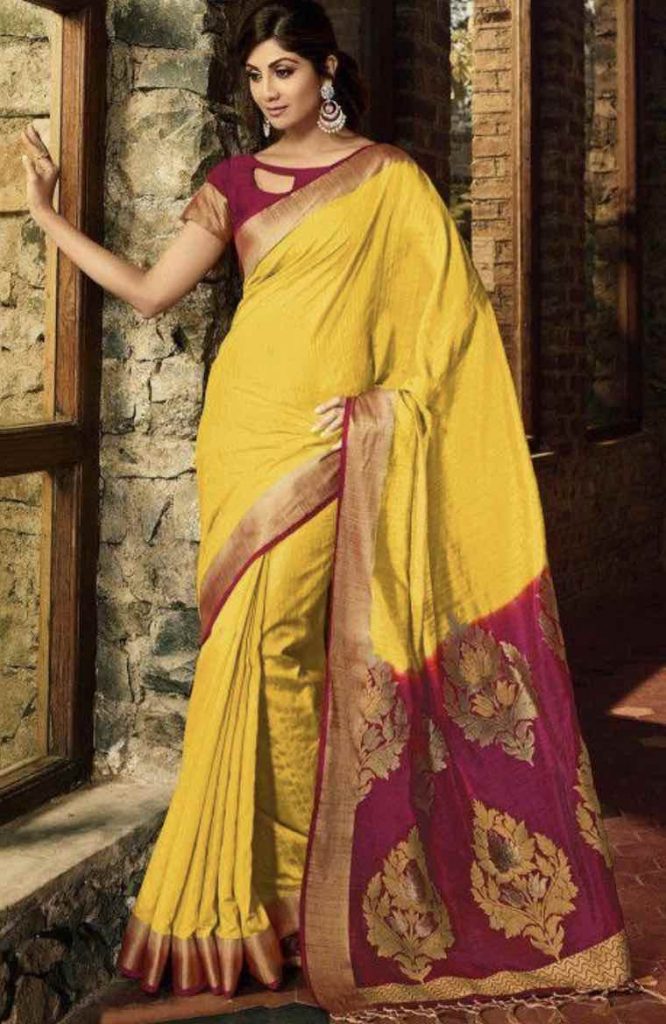 Check out this latest Bhagalpuri saree design. This eye-catching saree has intricate design patterns done on the borders that are guaranteed to draw a lot of attention to you. The yellow, brown, and green colours displayed on this saree blend well together to bring out the beauty of the saree. Wear it with a matching blouse with minimal accessories so as not to overcrowd the attire.