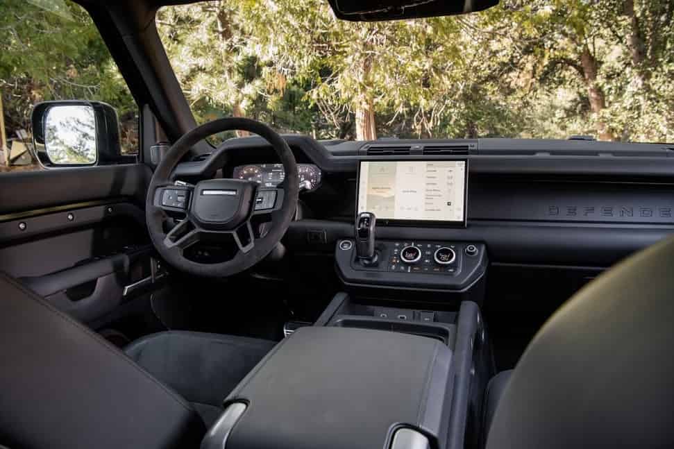 The Defender comes with a four-spoke steering wheel and a magnesium beam running across the dash. The 10-inch center screen takes up most of the space under which the gear lever and ignition switches are also mounted. The infotainment system is also available with an 11.4-inch center screen. The Defender also offers a range of safety features such as adaptive cruise control, lane assist, and emergency braking systems.