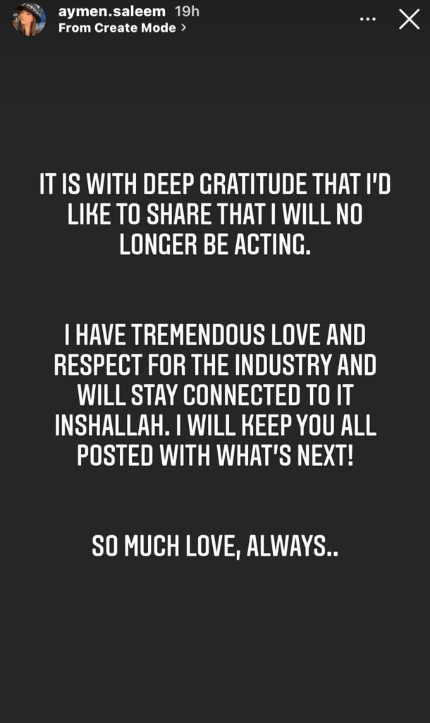 Aymen wrote on her Instagram story: “It is with deep gratitude that I’d like to share that I will no longer be acting. I have tremendous love and respect for the industry and will stay connected to it Inshallah. I will keep you all posted with what’s next! So much love, always.”