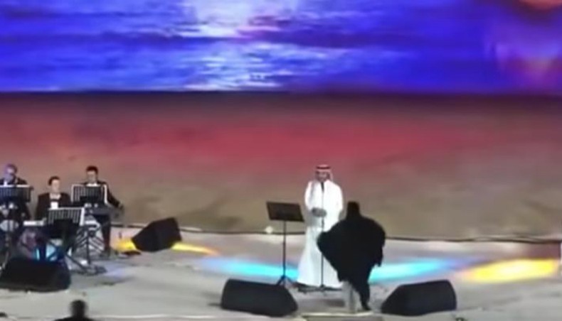 The woman, who has not been identified, was dressed in a full-length abaya and niqab face cover when she jumped on stage to hug Iraqi singer Majid al-Muhandis, whose love songs are hugely popular in the Gulf.
